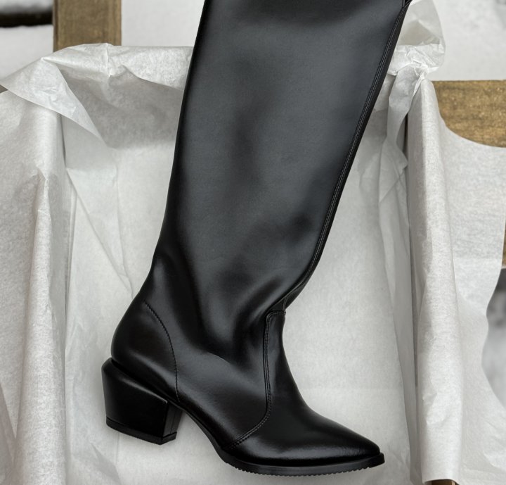 Pointed boots with stable slanted heels 6 cm high, made of eco-leather that retains the shape of the product throughout its height. The pair does not have a zipper, but we can add one upon request.