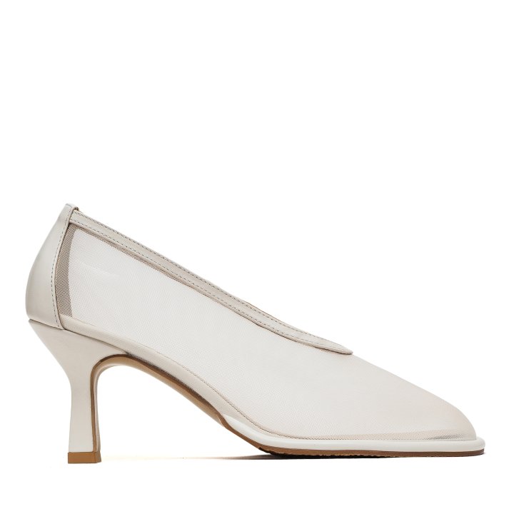 Semi-transparent mesh shoes with a round toe and comfortable 7 cm heels, made of genuine leather and transparent shoe mesh. The pair is decorated with an accent trim along the sole and has a functional elastic band on the inside of the shoe.